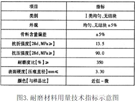 在工廠配置成半成品,現(xiàn)場施工用的干撒粉料。耐磨材料的用量主要根據(jù)說明書和設(shè)計要求來確定(其技術(shù)指標如下圖3)。