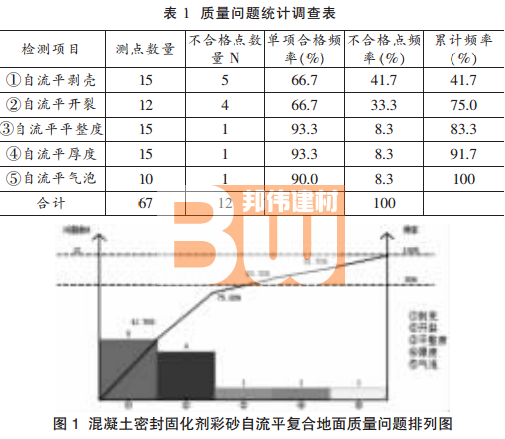 通過混凝土密封固化劑彩砂自流平復(fù)合地面質(zhì)量問題排列圖分析,自流平剝殼、開裂為影響整個混凝土密封固化劑彩砂自流平復(fù)合地面質(zhì)量的主要問題,累計頻率達(dá)到 75.0%。