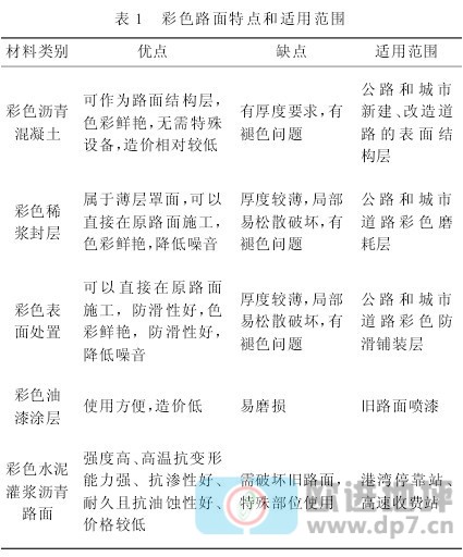 彩色路面特點和適用范圍見表1。