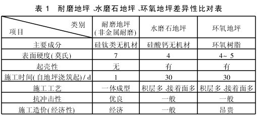 工業(yè)彩色耐磨地坪的施工采用機械化施工,并且施工時要和基層混凝土澆筑同步進行,與其他地坪相比,可大幅度縮短工期,避免了水磨石地坪施工時出現(xiàn)的泥漿、污水污染現(xiàn)象,且具有耐磨性好,不起塵;硬度高,可重載;表面致密防滲透;成本低的特點。地坪差異性見表1。