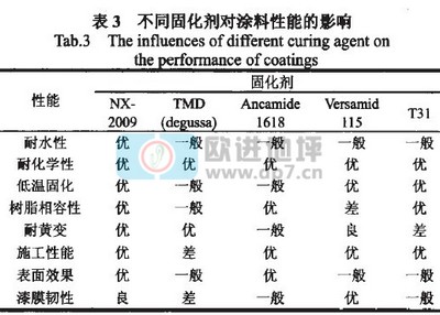 環(huán)氧樹脂本身是一種熱塑性高分子,單純的環(huán)氧樹脂本身并沒有多大的價值,只有加入固化劑使它轉(zhuǎn)變?yōu)槿S網(wǎng)狀立體結(jié)構(gòu),才能呈現(xiàn)其優(yōu)異的性能。目前無溶劑自流平地坪涂料使用的主要固化劑有脂肪胺及其加成物、脂環(huán)胺及其加成物、聚酰胺及其加成物、酚醛胺等。通常選用的固化劑中應該含有抗白花、耐酸、低溫固化(5~10℃)、耐黃變、抗水斑的成分,以避免無溶劑環(huán)氧自流平地坪涂料在低溫、高濕的環(huán)境下施工可能出現(xiàn)的油斑和白花現(xiàn)象,因此固化劑的選擇至關(guān)重要。試驗中采用了五種固化劑,分別與同一色漆搭配制備涂膜,觀察了它們對涂膜性能的影響,結(jié)果見表3。