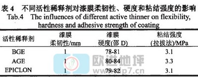 2.6不同活性稀釋劑對漆膜柔韌性、硬度和粘結(jié)強度的影響通過上述樹脂、固化劑、助劑和顏填料的選擇,我們得出了優(yōu)化后的無溶劑環(huán)氧自流平地坪涂料配方。以此配方為基礎(chǔ),保持其它條件不變,僅改變活性稀釋劑的種類,分別以BGE、AGE、EPICLON 703為活性稀釋劑制備了三個色漆(A組分),然后,采用NX.2009作為固化劑(B組分)分別制備涂膜,并測定它們的柔韌性、表面硬度以及與水泥基面的粘結(jié)強度,測試結(jié)果見表4。