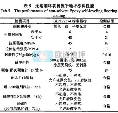 按照優(yōu)化后的配方,采用環(huán)保型活性稀釋劑EPICLON 703制備無溶劑環(huán)氧自流平地坪涂料,并按國標方法檢測其各項性能,多次重復試驗的測試結(jié)果重現(xiàn)性好,所制備涂料的各項性能達到或高于國標規(guī)定的指標,檢測結(jié)果見表5。