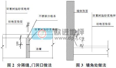 分隔縫按照砼墊層的分格縫設(shè)置,如圖2 所示,分隔縫用分格條,拉線固定,嚴格控制頂面標(biāo)高。地面與墻面交接處做45毅角。如圖3 所示。