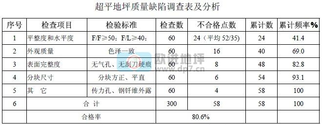2009 年5 月,在地面墊層上選定工作環(huán)境相同、9 米*50 米的范圍、做法與正式地坪相同的區(qū)域進(jìn)行試驗(yàn),對(duì)施工質(zhì)量缺陷進(jìn)行了全數(shù)檢查,并對(duì)檢查點(diǎn)進(jìn)行了統(tǒng)計(jì)分析和數(shù)據(jù)整理,具體統(tǒng)計(jì)結(jié)果如下: