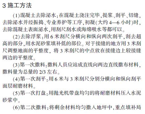 摘要:金剛砂耐磨地坪是由金剛砂、特種水泥和聚合物添加劑混合而成,該地坪與新澆筑混凝土同時施工,將其均勻撒布在初凝階段的混凝土地坪表面,經(jīng)專用磨光機(jī)打磨,即可在基礎(chǔ)混凝土上形成一層致密、高強(qiáng)度的耐磨損面層,可廣泛用于需要增強(qiáng)表面特性的混凝土面層。