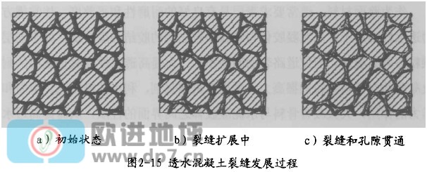 首先在應力較小的情況下,由于水泥石的固結(jié)作用,混凝土體基本上保持初始狀態(tài),粘結(jié)面上的微裂縫總體沒有發(fā)生改變;隨著應力的增加,過渡區(qū)的微裂縫開始產(chǎn)生,隨著荷載的增加,裂縫的長度和寬度加大,但這還沒有導致相互緊挨著的骨料間的粘結(jié)面的完全脫開,伴隨著這一過程,由于微裂縫的發(fā)展,骨料間存在著細微的位置調(diào)整,這期間會出現(xiàn)若干平臺區(qū),即應變增加,而應力不增加,甚至會出現(xiàn)應力減小的情況,這種情況出現(xiàn)的原因是透水混凝土中存在大量的孔隙,當壓力超過一定界限時,混凝土體內(nèi)存在著明顯的應力重分布的情況:最后當應力進一步加大,裂縫的進一步擴展,直至骨料間的水泥石粘結(jié)面完全斷開,裂縫和混凝土體中的孔隙貫通,導致混凝土的最終破壞,破壞過程如圖2所示。