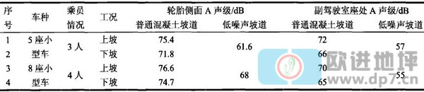 為了確定低噪聲坡道的實(shí)際降噪效果,對具有相同坡度的普通水泥坡道和低噪聲坡道處噪聲進(jìn)行了對比測試。小型轎車從車庫出入口中心線正上方通過,模擬車輛在坡道上行駛。汽車門窗緊閉,檔位為1擋,保持車速約為5-10km/h。設(shè)置兩處采樣點(diǎn):一處為輪胎外側(cè),普通混凝土坡道上的采樣點(diǎn)距車身外側(cè)邊線0.6-1.0m,低噪聲坡道上的采樣點(diǎn)距車身外側(cè)邊線0.3-0.5m,兩者均高出路面15cm;另一處為副駕駛室座上方。用VS302USB雙通道聲信號分析儀進(jìn)行噪聲采樣,并計算各種情況下采樣噪聲的總A聲級。低噪聲坡道與普通混凝土坡道噪聲對比測試結(jié)果見表1。由表1可知,與普通水泥坡道相比,當(dāng)車內(nèi)乘員為3~4人時,上坡狀態(tài)下低噪聲坡道上輪胎外側(cè)測點(diǎn)降噪量超過8.sdB,下坡狀態(tài)下的降噪量超過6.sdB。上坡狀態(tài)下駕駛室內(nèi)測點(diǎn)降噪量為15dB,下坡狀態(tài)下的降噪量為gdB。
