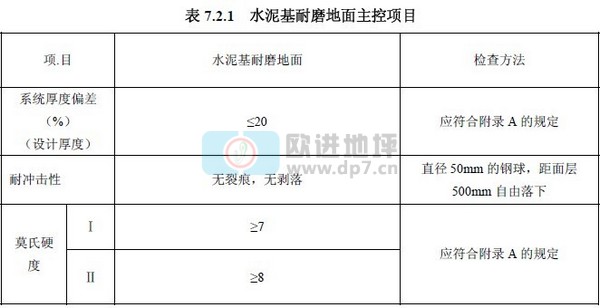 水泥基耐磨地面主控項目的驗收應(yīng)符合表 7.2.1 的規(guī)定。