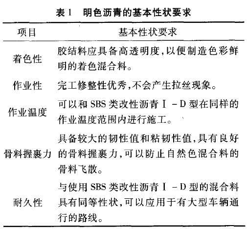 (2)彩色瀝青混凝土的結(jié)合料采用無色膠結(jié)料,主要指標(biāo)參考《公路瀝青路面施工技術(shù)規(guī)范》(JTG F40—2004)中對聚合物改性瀝青SBS(I—D)的技術(shù)要求,并且明色瀝青的基本性狀應(yīng)滿足表1要求。