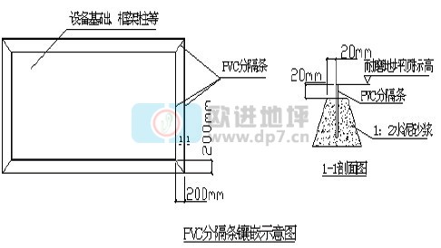 (4) 標(biāo)高測(cè)設(shè)及鑲嵌分隔條。用水準(zhǔn)儀將+50cm標(biāo)高所有框架柱及墻面上,并據(jù)此貼出灰餅,灰餅間距不大于3m,灰餅材料建議選用細(xì)石混凝土。根據(jù)測(cè)設(shè)的標(biāo)高在所有設(shè)備基礎(chǔ)、混凝土柱、溝道、坑池、洞口、管道與耐磨地坪交接處鑲嵌PVC分隔條。分隔條鑲嵌必須牢固、平直、順滑,上標(biāo)高準(zhǔn)確。鑲嵌完成后必須用施工線或者水準(zhǔn)儀符合校驗(yàn),本道工序是控制好耐磨地坪平整度的前提,標(biāo)高必須由專業(yè)技術(shù)人員進(jìn)行測(cè)量。分隔條鑲嵌如下圖所示: