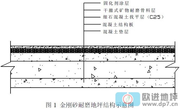 某煙草生產(chǎn)基地的建筑物包括建筑面積約9700m2 的實(shí)驗(yàn)工房,建筑面積約711m2 的香料庫(kù)兩棟單體單層建筑和占地面積約2592m2、建筑面積約7200m2 的香糖料調(diào)配中心的單體三層建筑。本工程的技術(shù)難點(diǎn)主要有:廠房處于河道范圍,土質(zhì)穩(wěn)定性差;地面基土沉降不均勻,裂縫控制難度較大。原設(shè)計(jì)地面做法:1 5 0mm厚C1 5 混凝土墊層;8 0 m m 厚C 2 0 細(xì)石混凝土;2 0 mm 厚水泥砂漿。本工程室內(nèi)土為回填土,土質(zhì)較差,原圖紙關(guān)于室內(nèi)地面設(shè)計(jì)做法未考慮土質(zhì)的情況,且工藝上分二次施工,不利于保證地面的質(zhì)量。針對(duì)工程特點(diǎn)和生產(chǎn)需要,制定出大面積承重金剛砂耐磨地坪施工工藝,地面耐磨面料以水泥和復(fù)合增強(qiáng)外加劑為膠結(jié)材料,用人造燒結(jié)礦物及天然硬度礦物組合耐磨料拌合成。該煙草生產(chǎn)基地混凝土地面采用金剛砂耐磨地坪,具有表面硬度高、密度大、耐磨、不生灰塵、不易剝離等特點(diǎn),通過(guò)對(duì)該項(xiàng)目金剛砂耐磨地坪采用合適的施工工藝和技術(shù),取得了良好的效果。