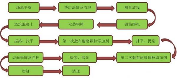 金剛砂耐磨地坪施工的工藝流程為: