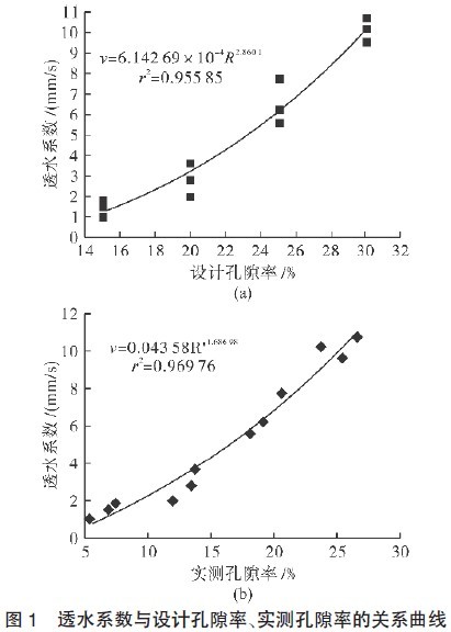 由于進(jìn)行透水混凝土的配合比設(shè)計時,透水系數(shù)并不能直接通過配合比設(shè)計確定。雖然孔隙率是反映透水混凝土透水系數(shù)的一個重要指標(biāo),但孔隙率與透水系數(shù)并不存在對等關(guān)系,其他一些因素比如孔隙的特征、大小及孔隙的路徑走向等,對透水混凝土的透水性能也有著不可忽略的影響。因此,探討孔隙率與透水系數(shù)的關(guān)系對透水混凝土配合比設(shè)計具有重要意義。