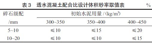 由試驗結(jié)果可知,“體積砂率”對透水混凝土的強(qiáng)度具有重要的影響,在透水混凝土的配合比設(shè)計中引入“體積砂率”這一參數(shù),對透水混凝土中摻用砂子時配合比設(shè)計具有重要的指導(dǎo)意義。本試驗中最佳體積砂率為5%,且體積砂率不宜超過15%。對于不同的水泥用量及石子級配,體積砂率的取值不同,表3 給出了經(jīng)過試驗研究得到的砂率取值表。